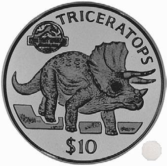 Al centro un dinosauro, il Triceratopo. Attorno la scritta in inglese "TRICERATOPS" a sinistra il logo del Jurassic Park, sotto il valore "$10".