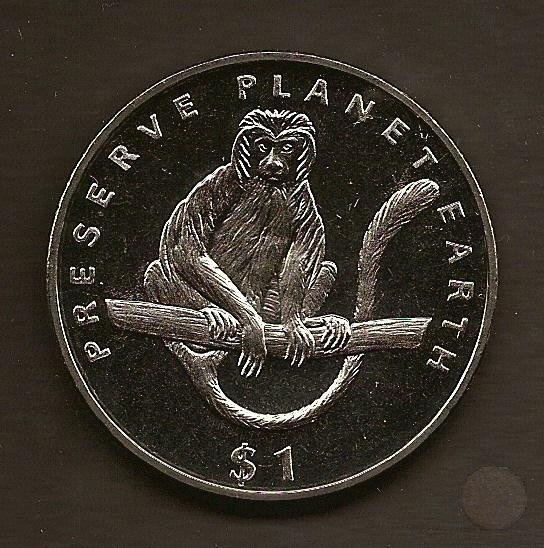 Al centro una scimmia Colobus (Bianca e Nera) su un ramo. Attorno la scritta in inglese "PRESERVE PLANET EARTH" e sotto il valore "$ 1".