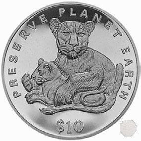 Al centro una leonessa con il suo piccolo. Attorno la scritta in inglese "PRESERVE PLANET EARTH" e sotto il valore "$10".