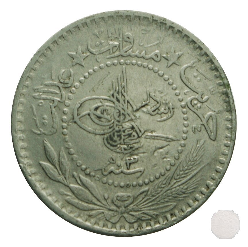 IN BASSO LA DATA SEPARATA DA SPIGHE DI GRANO E RAMI, IN ALTO LA SCRITTA ISLAMICA A DESTRA E A SINISTRA DIVISA DA DUE STELLE, E DATA IN NUMERI ISLAMICI.